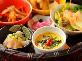 当店お勧めの「農園かご盛りランチ」は、竹籠の中に6種類の季節の味を盛り込んでいます。カロリーや塩分にも気を使ったランチとなります。
